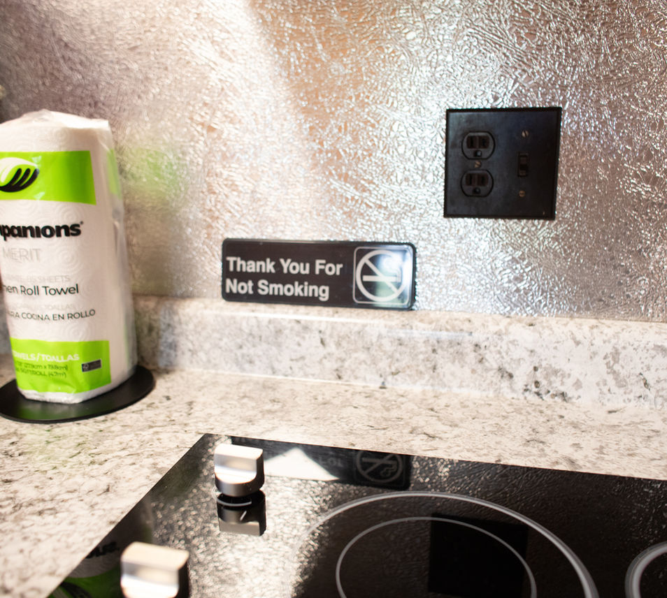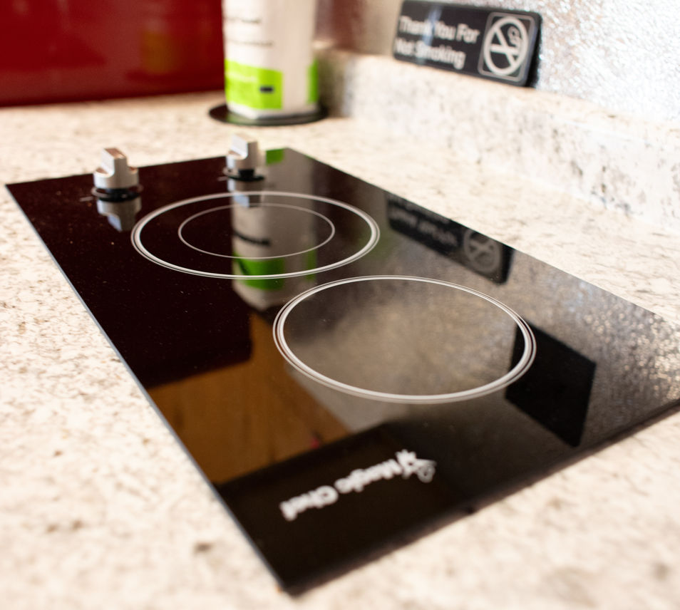 NEW IN 2025! The kitchenette is now equipped with a microwave, AND a new mini fridge, new two burner stove, sink, dinette table and chairs.
